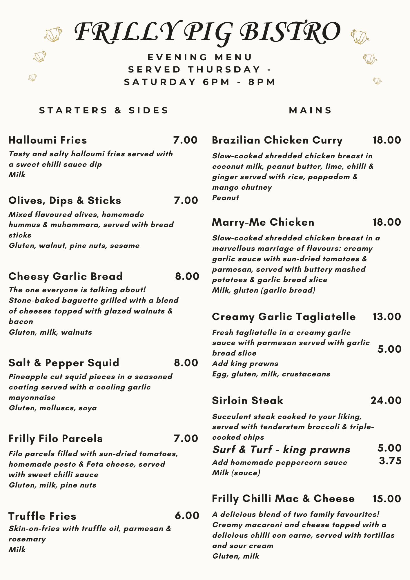 Walking past Sunday lunchtime we decided to stop and have Sunday lunch. We got a lovely welcome and was soon seated and order taken. Sunday lunch was absolutely delicious- roast potatoes best I have ever tasted! everything else was perfection. We both had deserts and again they were delicious. We will definitely be visiting again to try the evening menu. The owner was lovely and made us feel very welcome and the two young girls who waited on very polite and friendly. If you have never tried the Frilly Pig Bistro give it a go you will not be disappointed. Thank you and we will see you soon. 😊